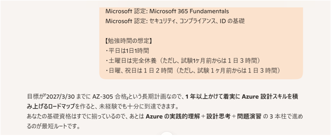 上記をもとに、勉強計画(何をどれぐらいやれば良いか)をAIに作成させます。